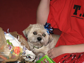 I forgot to tell you that we got up too early for the dogs on Christmas. :) They weren't even interested in their gifts, because they were too tired. Later, after a long nap, they both were like different dogs and were all excited about their new toys and treats. Here's my sleepy grand dog before his nap.